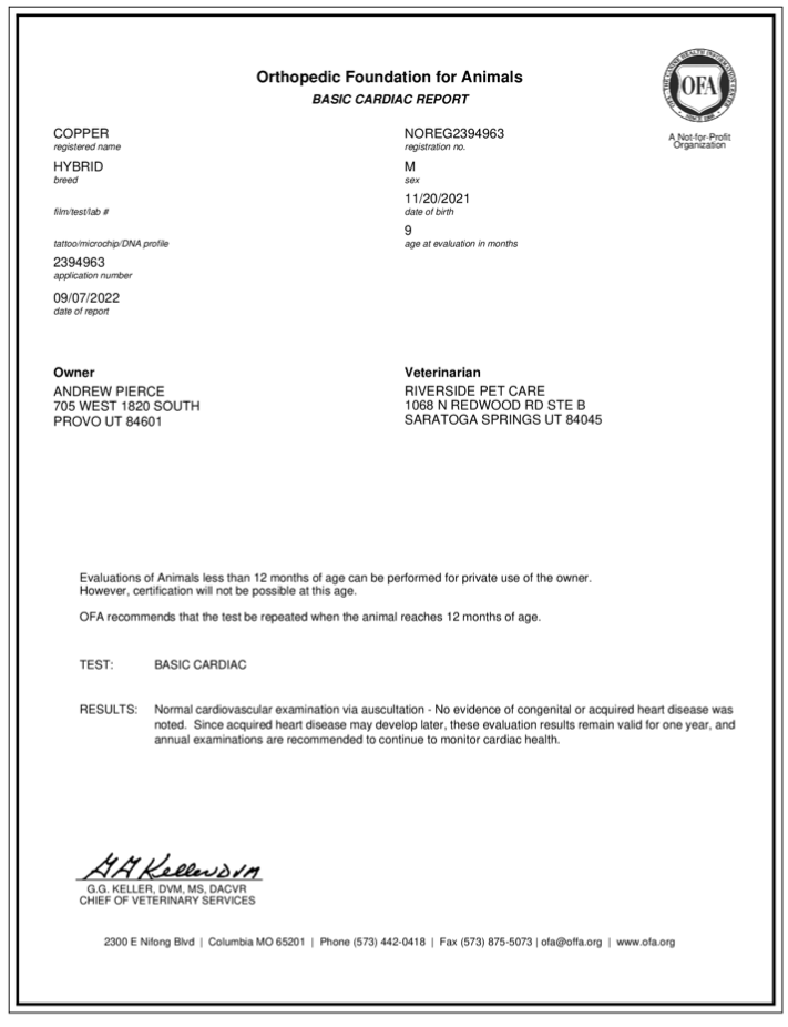 Deposit $150 (non-refundable, transferable). Please reach out as soon as you notice your female is in heat so we can schedule.